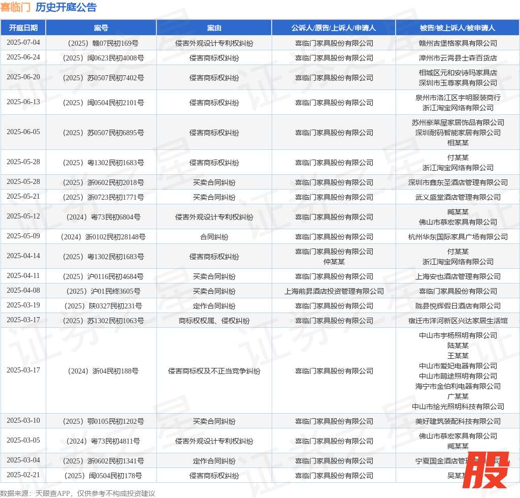 案号:(2025)苏0507民初7402号审理法院:苏州市相城区人民法院案由:侵害商标权纠纷当事人信息: 原告/上诉人:喜临门家具股份有限公司 被告/被上诉人:相城区元和安诗玛家具店、深圳市玉尊家具有限公司开庭日期:2025年6月20日根据统计,近一年内以喜临门家具股份有限公司为当事人的历史开庭公告有50则,其中案由为“买卖合同纠纷”的公告以18则居首,其次为“侵害商标权纠纷”有13则,“侵害外观设计专利权纠纷”有6则。历史开庭公告(前20条)如下: