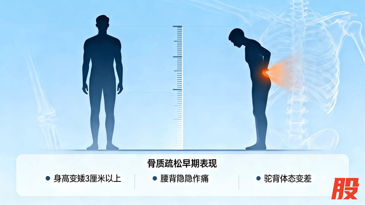 事实上,骨质疏松早期并非毫无征兆,只是那些信号太隐蔽,容易被我们忽略:比如,身高比年轻时矮了3厘米以上;经常觉得腰背隐隐作痛,说不出具体哪里不舒服;驼背越来越明显,体态越来越差。这些看似不起眼的小变化,其实都是骨量在悄悄流失的信号。